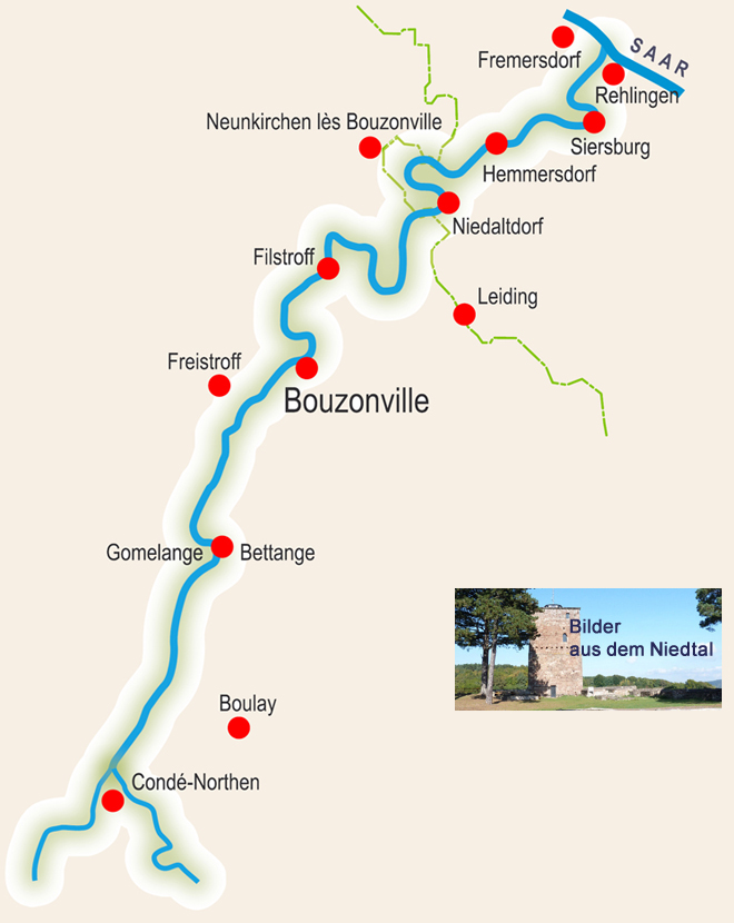 Dem Lauf der Nied in Richtung Quellflüsse folgend kommt man u.a. zu diesen interessanten Punkten: